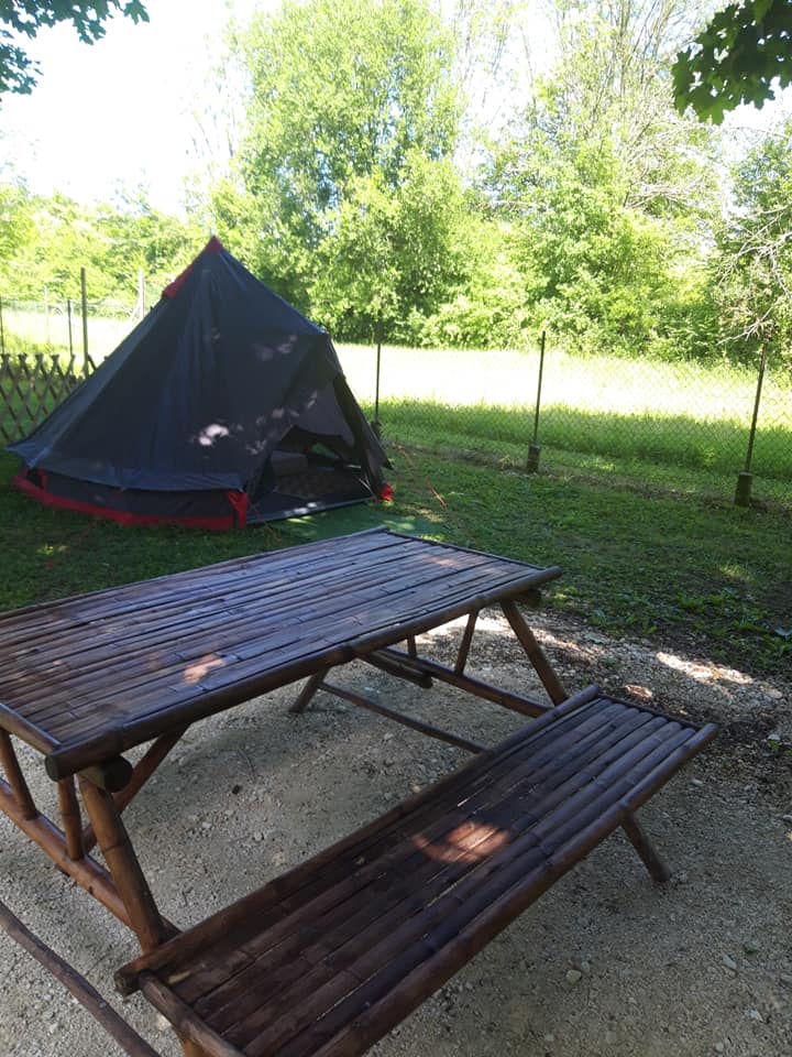 Le tipi possède 2 lits d’une personne ainsi qu’une table de nuit avec lampe, sur l’emplacement tipi une table bambou pour les repas vous est proposée.